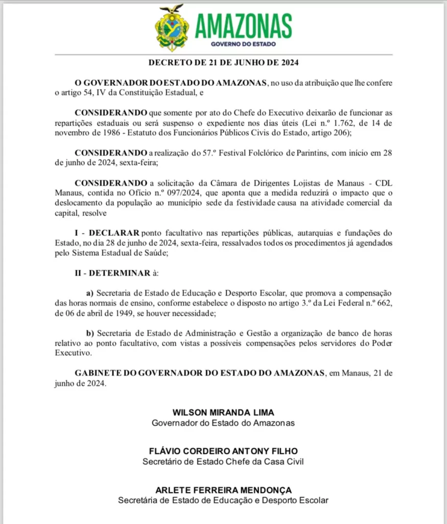 “O Festival Folclórico de Parintins é um momento de grande significado para nosso estado. Esse evento não só celebra nossa rica cultura, mas também impulsiona a economia local, gerando empregos e atraindo turistas. Ao decretar ponto facultativo, estamos reconhecendo a relevância do festival e proporcionando à população a oportunidade de vivenciar essa tradição”, declarou o governador Wilson Lima.