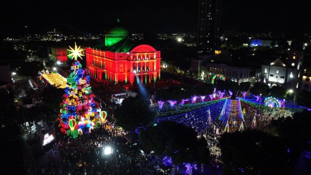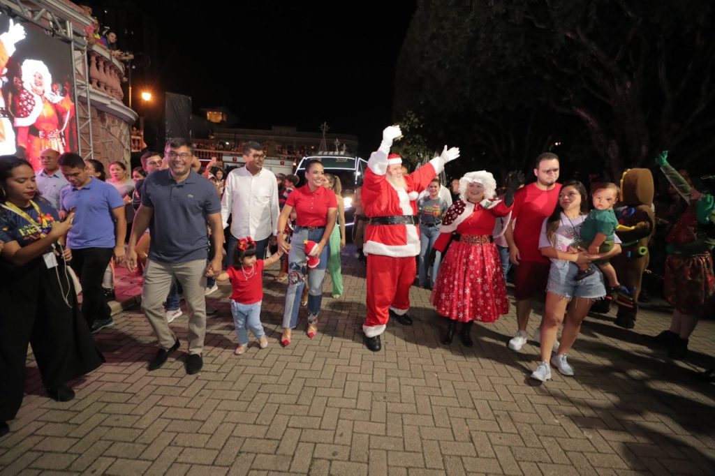 Ao lado da primeira-dama do Amazonas, Taiana Lima, e da filha caçula, Maria Antonella, Wilson Lima acionou as luzes de toda a decoração montada no local. A programação incluiu cenografia inédita, chegada do Papai Noel e abertura dos espaços culturais com atrações gratuitas.