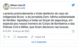 “Lamento profundamente o triste desfecho do caso do indigenista Bruno e do jornalista Dom. Minha solidariedade às famílias. Agradeço a todas as forças de segurança, em especial aos nossos homens do Corpo de Bombeiros e das Polícias Civil e Militar, que foram decisivos nas buscas”, disse o governador.