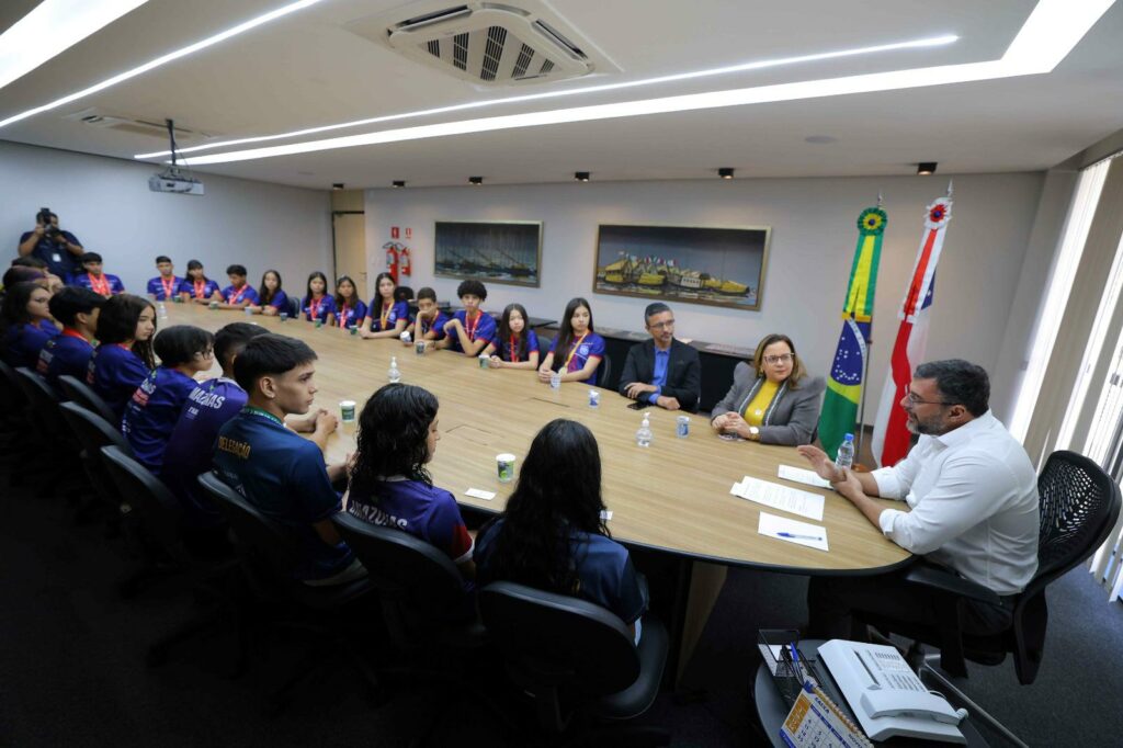 O governador Wilson Lima também recebeu sete alunos da rede estadual que vão representar o Amazonas no mundial escolar Gymnasiade 2024. O grupo de atletas competirá na modalidade de wrestling em Bahrein, no Oriente Médio, de 23 a 31 de outubro.