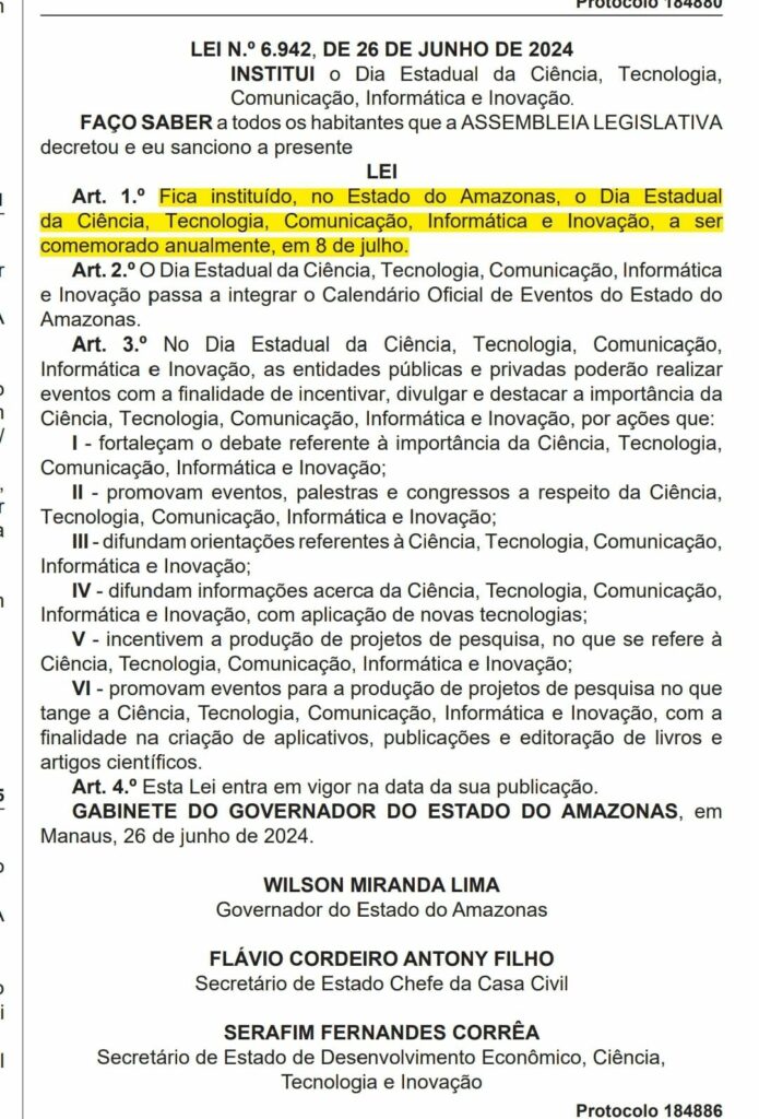 Amazonas – O governador Wilson Lima sancionou a Lei 6.942/2024, que institui o Dia Estadual de Ciência, Tecnologia, Comunicação, Informática e Inovação. A data será comemorada anualmente no dia 8 de julho, promovendo o reconhecimento e a valorização dessas áreas fundamentais para o desenvolvimento do estado. A lei foi publicada no Diário Oficial Eletrônico do Estado do Amazonas (DOE) no dia 26 de junho.