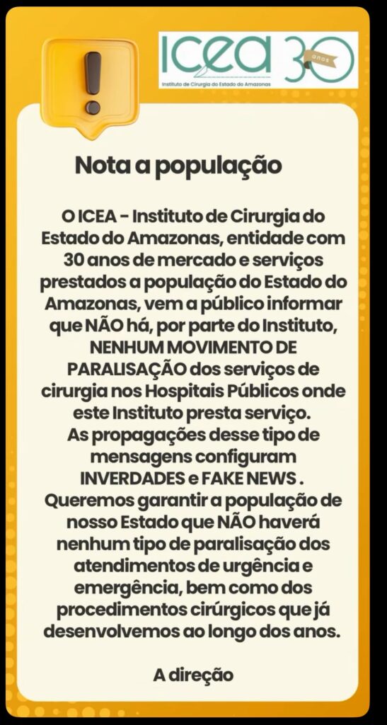 O ICEA também se pronunciou por meio de nota oficial, repudiando as informações falsas e garantindo a continuidade dos atendimentos. Com mais de 30 anos de atuação no Amazonas, o instituto reforçou seu compromisso com a população.