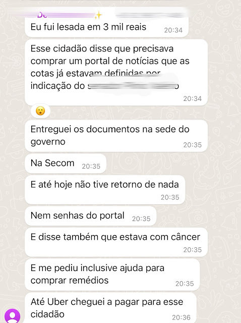 “Hoje recebi o relato de várias pessoas denunciando o jornalista dizendo que o mesmo prometia cotas do governo e da prefeitura para portais.