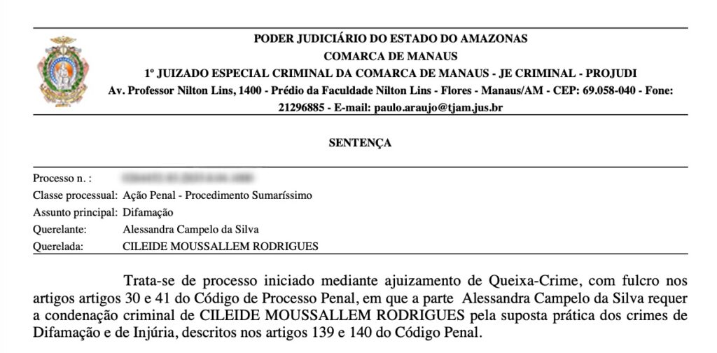 Amazonas – O que nos bastidores já era interpretado como uma tentativa de levar embate político para o campo criminal acabou tendo um desfecho que inverteu o rumo da história. A queixa-crime movida pela deputada Alessandra Campelo contra Cileide foi interrompida logo no início pelo Tribunal de Justiça do Amazonas, que rejeitou a ação por falta de base jurídica, ausência de prova de crime e inexistência de autoria comprovada. O processo foi extinto sem sequer avançar para fase penal.