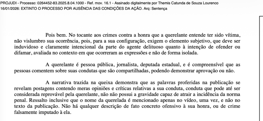 A sentença registra que o conteúdo questionado se enquadra no campo de crítica política a agente pública, algo inerente ao debate democrático.