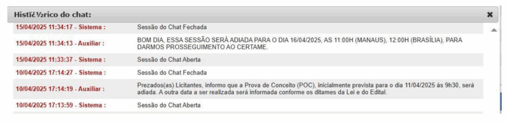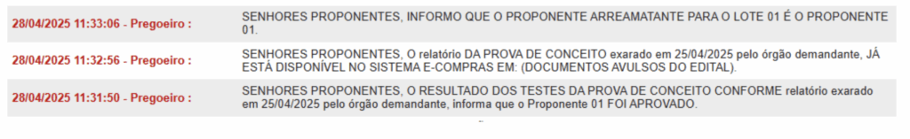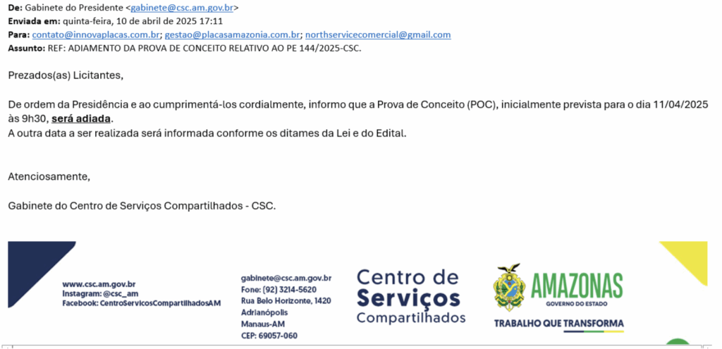 “Licitantes, informo que a Prova de Conceito (POC), inicialmente prevista para o dia 11/04/2025 às 9h30, será adiada.”