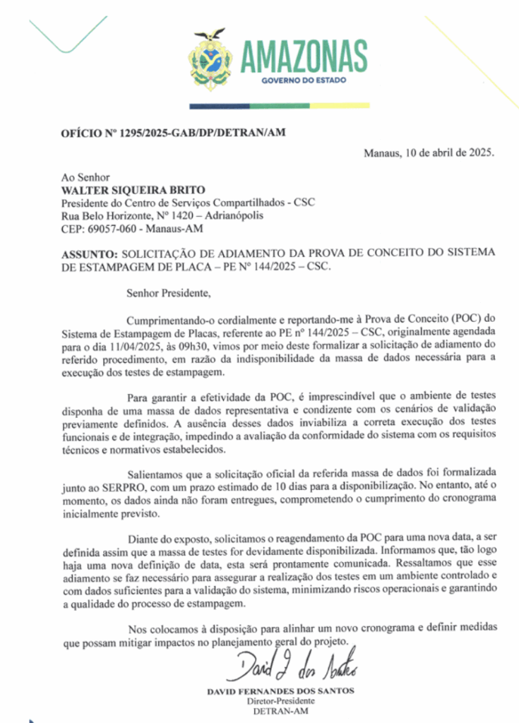 Posteriormente, a POC foi oficialmente cancelada por meio do Ofício nº 1295/2025 – GAB/DETRAN/AM, assinado pelo diretor-presidente do DETRAN, David Fernandes dos Santos, sob a justificativa de “indisponibilidade da massa de dados”. A explicação, no entanto, não se sustenta tecnicamente: