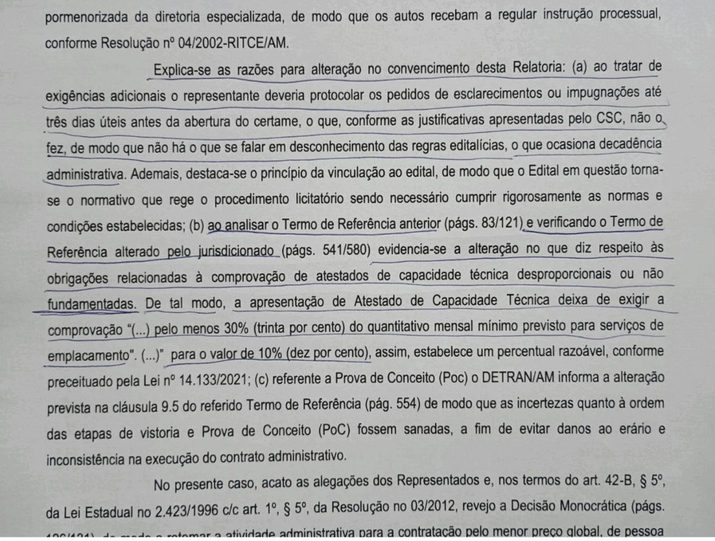 O caso não para por aí. No pregão anterior (nº 580/2024), a Innova ficou em quarto lugar, mas recorreu ao TCE-AM pedindo mudanças no Termo de Referência. E conseguiu.