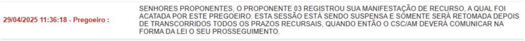 Já no Pregão nº 144/2025 – CSC/AM, que substituiu o anterior, não foi encontrado, ata ou resenha pública publicada com informações do cancelamento. O que se sabe é que o CSC, enviou um e-mail, copiando todos os concorrentes.