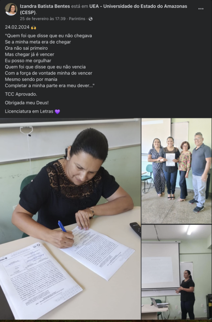 Os talentos acadêmicos da filha, em grande parte foram influenciados por sua mãe. Izandra Batista Bentes tinha 40 anos, formada em administração pela UFAM, atualmente ela estava cursando licenciatura em Letras, pela Universidade Estadual do Amazonas(UEA). Izandra tinha dois filhos com o autor do crime, o policial militar Raimundo Jovane. Em sua última postagem nas redes sociais, a mulher mostrou estar empolgada por estar na reta final do curso, com TCC aprovado e que já receberia o canudo em Letras. Confira: