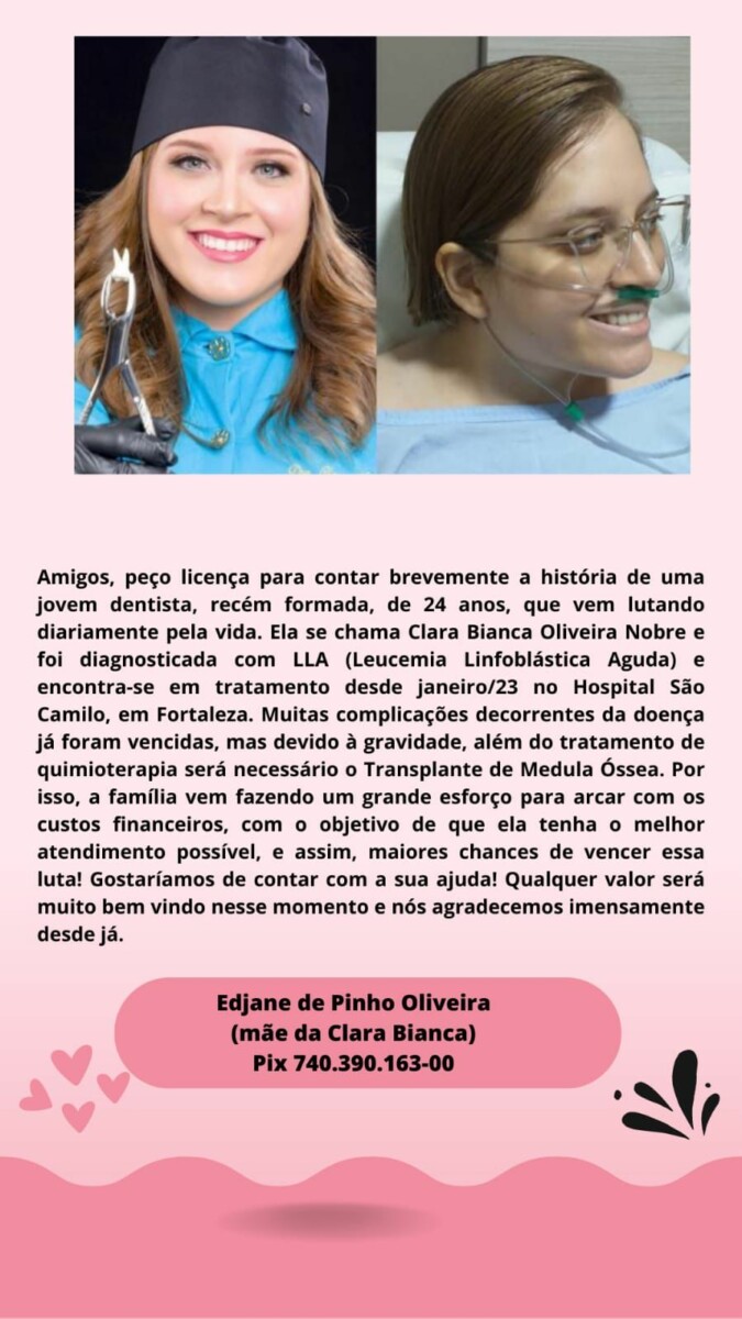 Brasil – Uma jovem chamada Clara Bianca Oliveira Nobre, de 24 anos, recém-formada em odontologia, descobriu que está com leucemia durante uma viagem à Fortaleza. Desde lá, ela vem lutando pela vida e sua família está se mobilizando para ir até ela e prestar todo o apoio necessário.