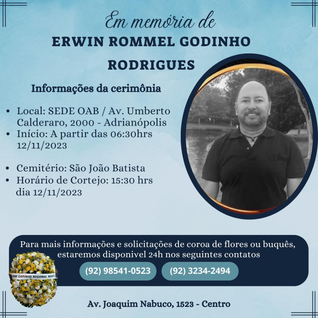 Manaus – O corpo de Erwin Rommel Godinho Rodrigues, advogado e servidor do Tribunal de Contas do Estado do Amazonas (TCE-AM), está sendo velado na sede da Ordem dos Advogados do Brasil (OAB). O enterro acontece neste domingo (12), no Cemitério São João Batista, zona Sul da capital amazonense.