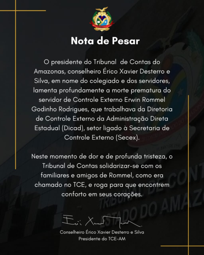 O presidente do TCE-AM, conselheiro Érico Desterro, emitiu uma nota lamentando profundamente a perda do servidor que atuava na diretoria de Controle Externo da Administração Direta Estadual (Dicad).