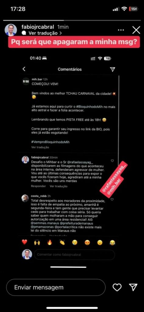 Manaus – O Portal e TV CM7 Brasil publicou, na noite dessa segunda-feira (27), o relato do jovem Fábio Cabral que supostamente foi vítima de agressão no bloco do famoso ‘Miih Bar’, que fica localizado na Avenida Mário Ypiranga, no bairro Adrianópolis, zona Centro-Sul de Manaus.