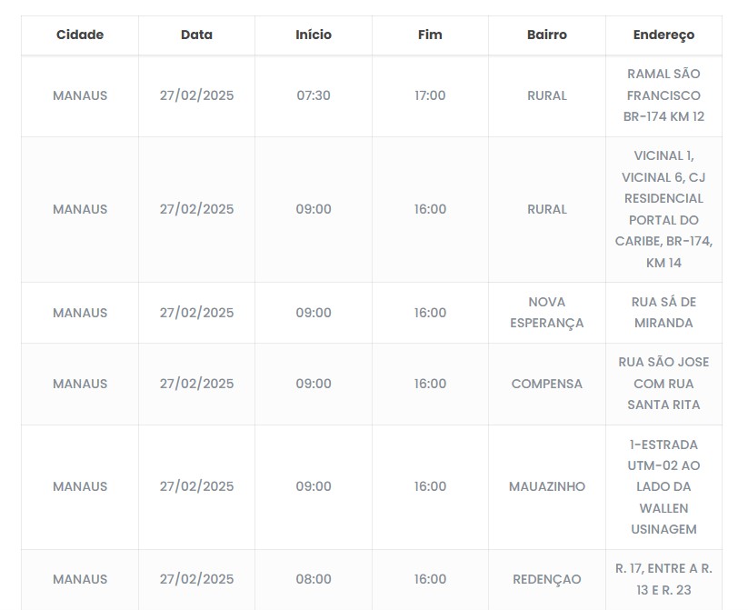 As áreas afetadas incluem os bairros Nova Esperança, Compensa, Mauazinho, Redenção, além de dois ramais na BR-174.