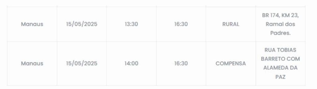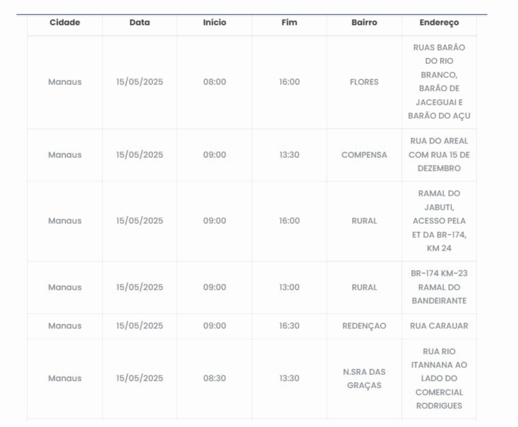 Manaus – Quatro bairros e três ramais ficarão sem energia nesta quinta-feira (15). A interrupção do serviço ocorrerá devido a uma manutenção a ser realizada na rede elétrica.
