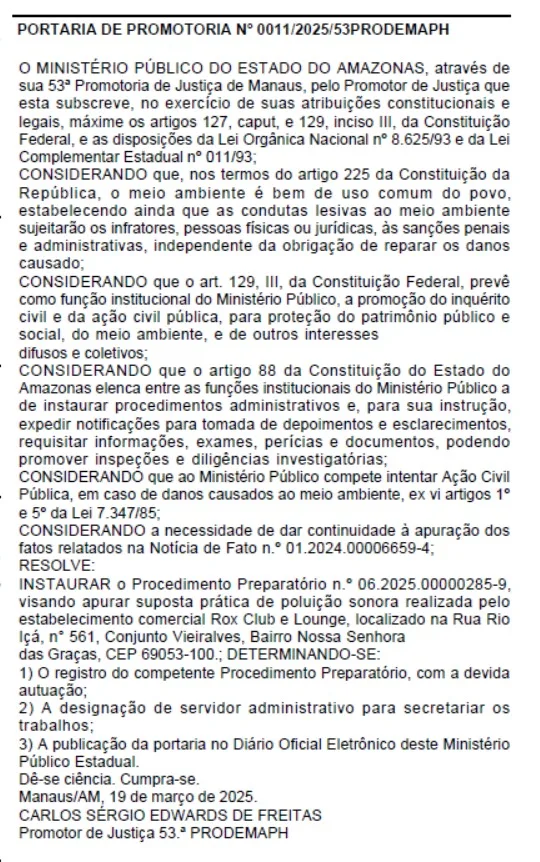 Manaus – O Ministério Público do Amazonas (MPAM) deu início a uma investigação contra a casa de shows Rox Club & Lounge, localizada no conjunto Vieiralves, bairro Nossa Senhora das Graças, zona Centro-Sul de Manaus, por suposta prática de poluição sonora. O caso, que começou como uma Notícia de Fato, foi elevado nesta quarta-feira (19) a Procedimento Preparatório, registrado sob o número 06.2025.00000285-9, após denúncias recebidas pelo órgão.