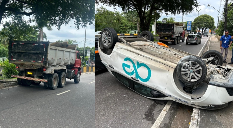 O incidente aconteceu por volta das 9h e interrompeu o trânsito na via. O carro branco da Águas de Manaus, placa SIB-1D74, foi atingido pela caçamba que tentava ultrapassar o veículo, o que provocou a perda de controle e o subsequente capotamento, deixando o veículo de cabeça para baixo na pista.