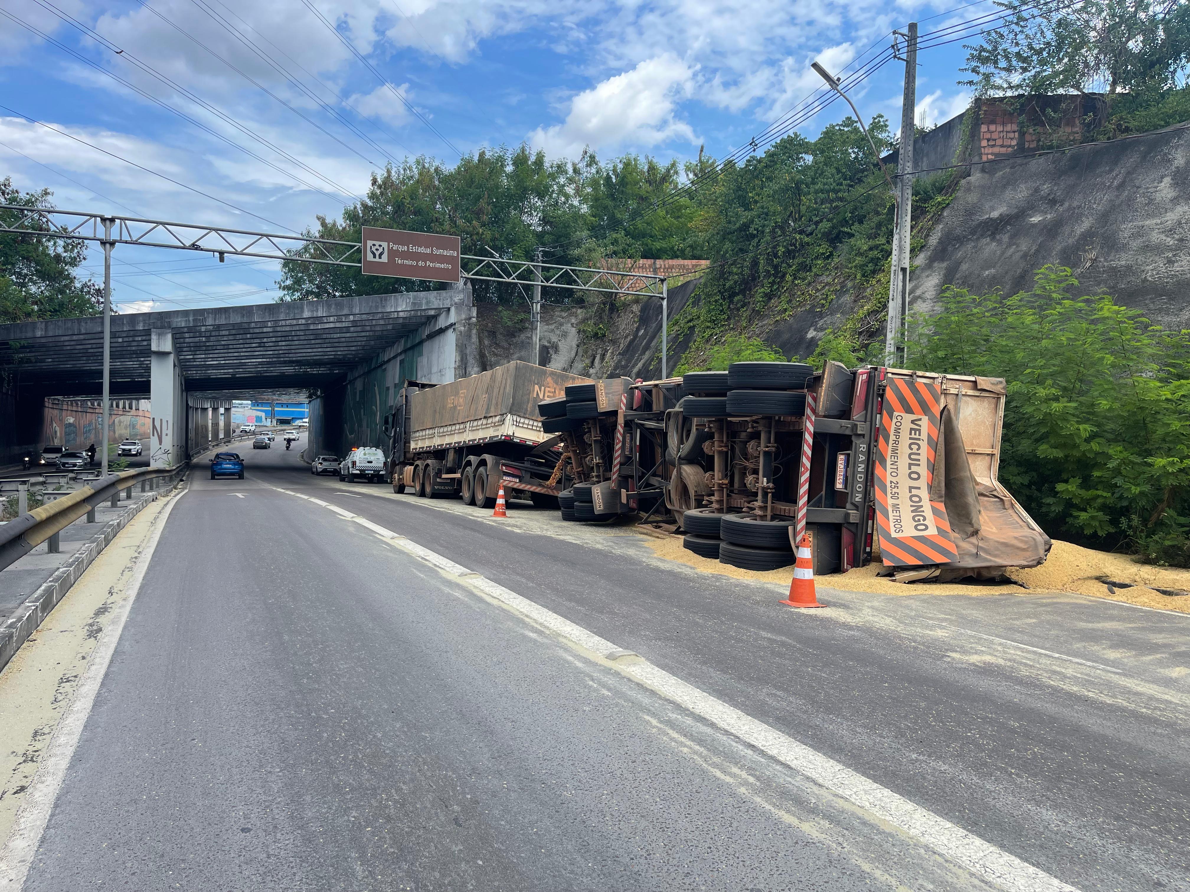 Manaus – Um caminhão carregado de grãos de soja tombou nesta segunda-feira (25), na avenida das Flores, bairro Cidade Nova, zona norte da capital amazonense. Apesar do susto, não houve registro de feridos.