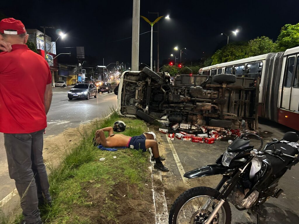 Caminhão com carregamento de cerveja tomba durante acidente no Coroado; veja vídeos