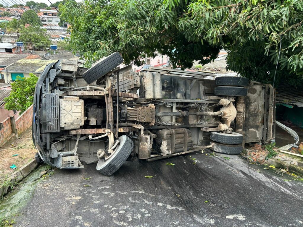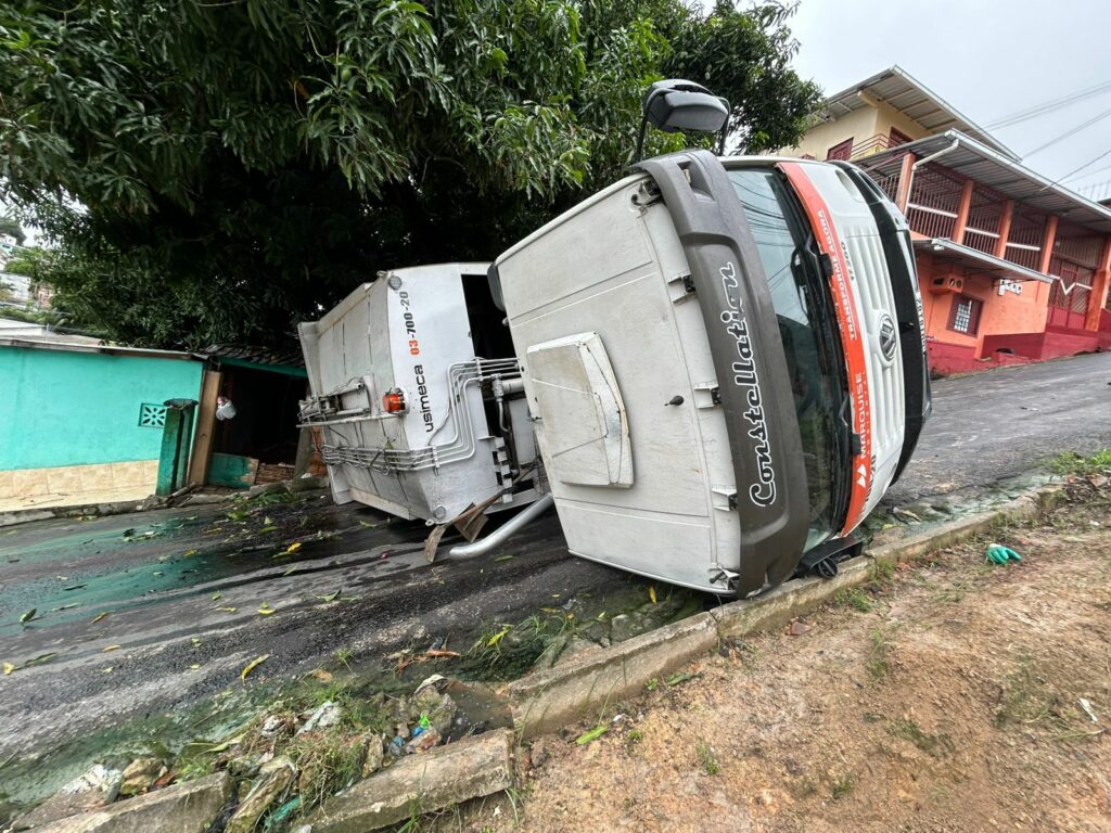 Manaus – Na manhã desta segunda-feira (6/1), um caminhão de lixo tombou em uma ladeira localizada na rua Manoel Ribeiro, no bairro Tancredo Neves, zona Leste de Manaus. O incidente chamou atenção dos moradores, que registraram imagens do veículo virado.