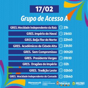 As escolas do grupo de acesso A que desfilam no dia 17/2, são Mocidade Independente da Raiz, às 21h; Império do Havaí, às 21h50; Beija-Flor do Norte, às 22h40; Acadêmicos da Cidade Alta, às 23h30; Sem Compromisso, à 0h20; Presidente Vargas, à 1h10; Dragões do Império, às 2h; Tradição Leste, às 2h50; e Mocidade Independente do Coroado, às 3h40.