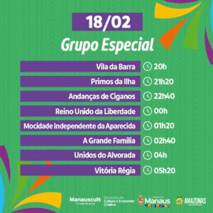 As agremiações do grupo Especial que entrarão na avenida no sábado, 18/2, são: Vila da Barra, às 20h; Primos da Ilha, às 21h20; Andanças de Ciganos, às 22h40; Reino Unido da Liberdade, à meia-noite; Mocidade Independente da Aparecida, à 1h20; A Grande Família, às 2h40; Unidos do Alvorada, às 4h; e Vitória-Régia, às 5h20.