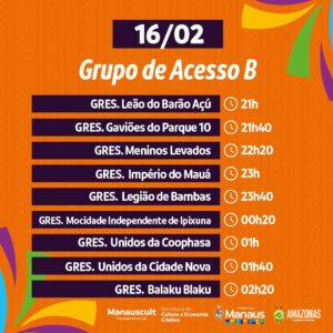 De acordo com o cronograma, os desfiles das agremiações do dia 16/2 do grupo de acesso B iniciam às 21h,com a Leão do Barão Açú; Gaviões do Parque 10, às 21h40; Meninos Levados, às 22h20; Império do Mauá, às 23h; Legião de Bambas, às 23h40; Mocidade Independente de Ipixuna, à 0h20; Unidos da Coophasa, à 1h; Unidos da Cidade Nova, à 1h40; e Balaku Blaku, às 2h20.