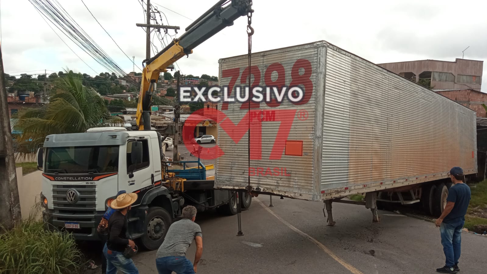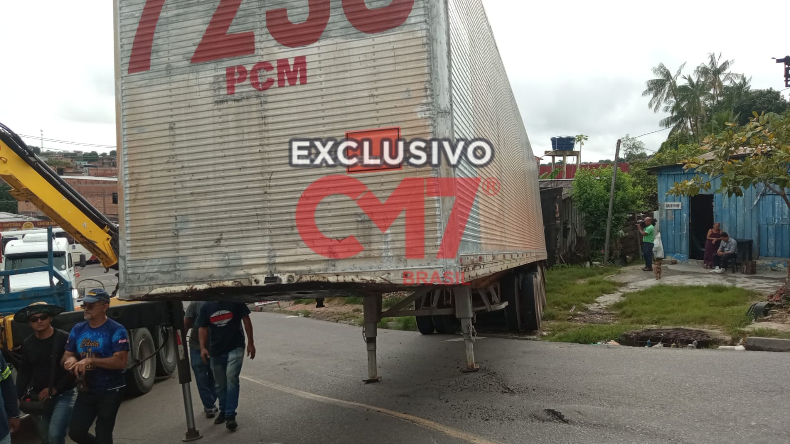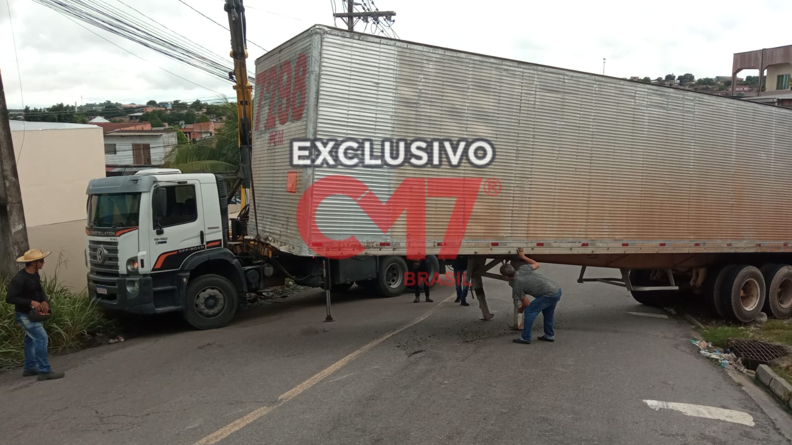 O impacto foi tão forte que a carreta ficou presa no local, sem possibilidade de movimentação imediata. O peso do veículo e a inclinação da rua aumentam os riscos de novos danos, o que preocupa os moradores da região.