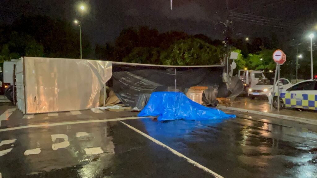 Carreta fica destruída após tombar em plena avenida de Manaus; veja vídeos