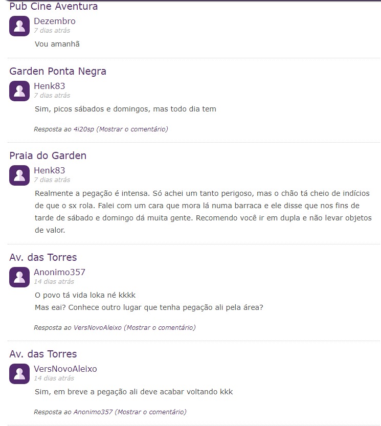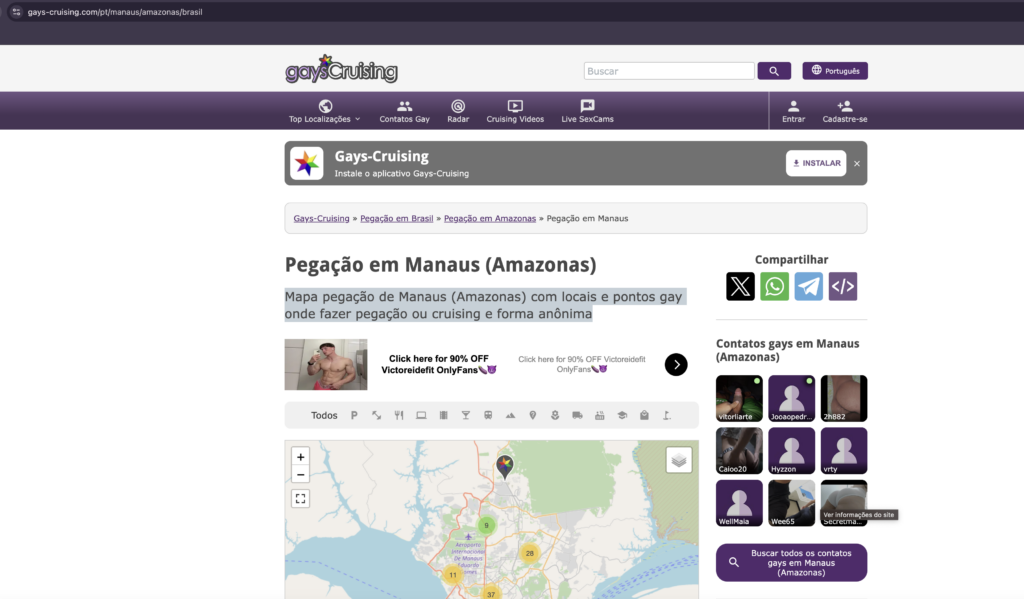 Além disso, a prática de ‘pegada’ e ‘cruising’ em Manaus tem sido divulgada até mesmo em plataformas online, como o site gays-cruising.com, que mapeia pontos de encontro e locais conhecidos na cidade para encontros sexuais anônimos. O site oferece um mapa interativo com locais como parques, áreas de descanso nas estradas, e até banheiros públicos, onde homens podem se encontrar para sexo casual. Usuários podem interagir, compartilhar experiências, votar e até comentar sobre os locais, além de fazer check-in para sinalizar sua presença.