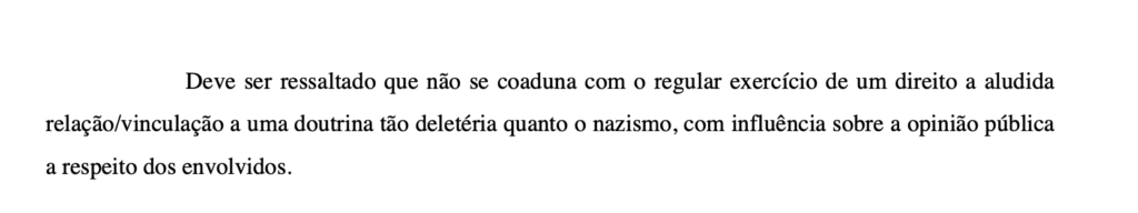 “Não se coaduna com o regular exercício de um direito a aludida relação/vinculação a uma doutrina tão deletéria quanto o nazismo”, destacou a juíza.