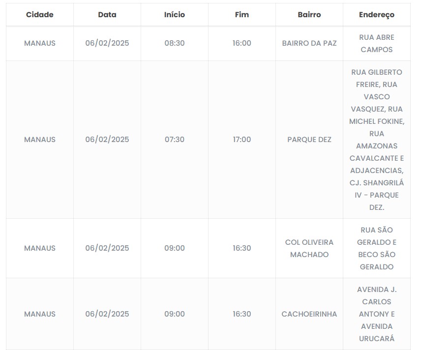 Cinco bairros de Manaus ficarão sem energia nesta quarta-feira (5); confira