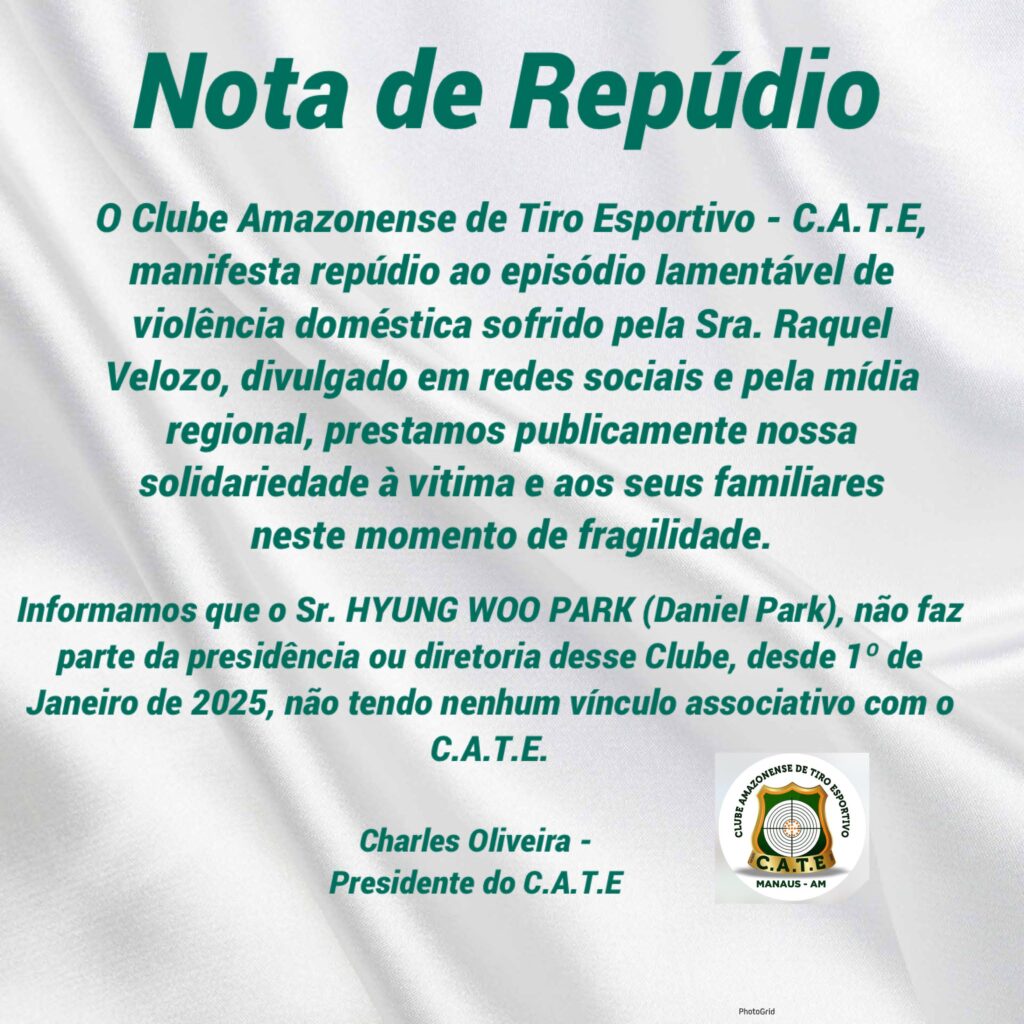 Manaus – O Clube Amazonense de Tiro Esportivo (C.A.T.E) publicou, nesta quarta-feira (9), uma nota oficial de repúdio em resposta a um grave caso de violência doméstica que ganhou destaque na mídia. O episódio envolve Daniel Park, ex-instrutor de tiro esportivo e empresário, denunciado por sua ex-mulher, Raquel de Paula, por agressões físicas e psicológicas.