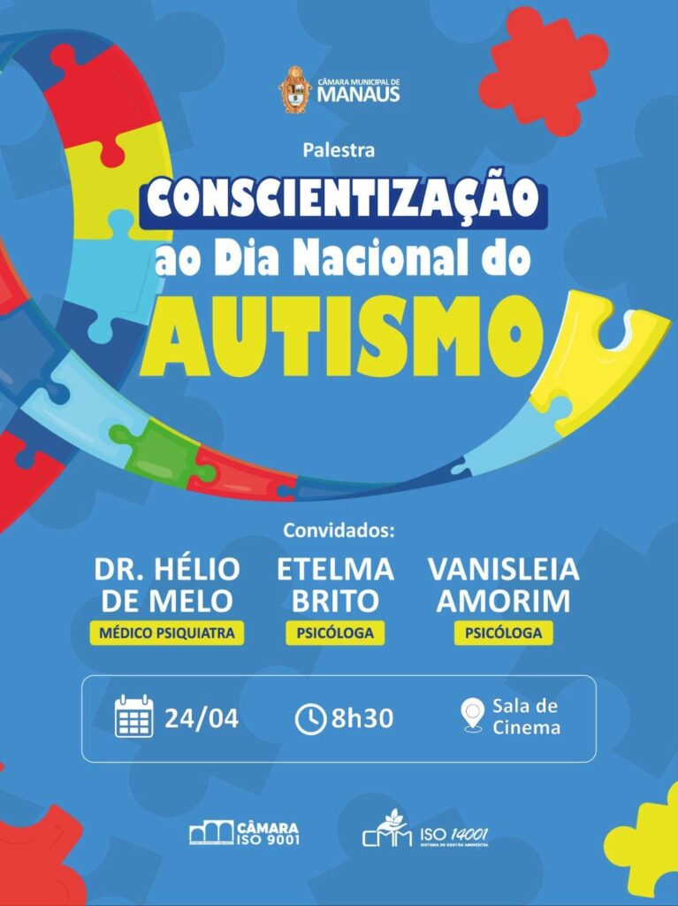 Manaus – A Câmara Municipal de Manaus (CMM) realiza, nesta quinta-feira (24 de abril), uma palestra em Conscientização ao Dia Nacional do Autismo. Coordenada pela Diretoria de Saúde da Casa Legislativa, a atividade é aberta ao público e acontecerá na Sala de Cinema da CMM, a partir das 8h30.