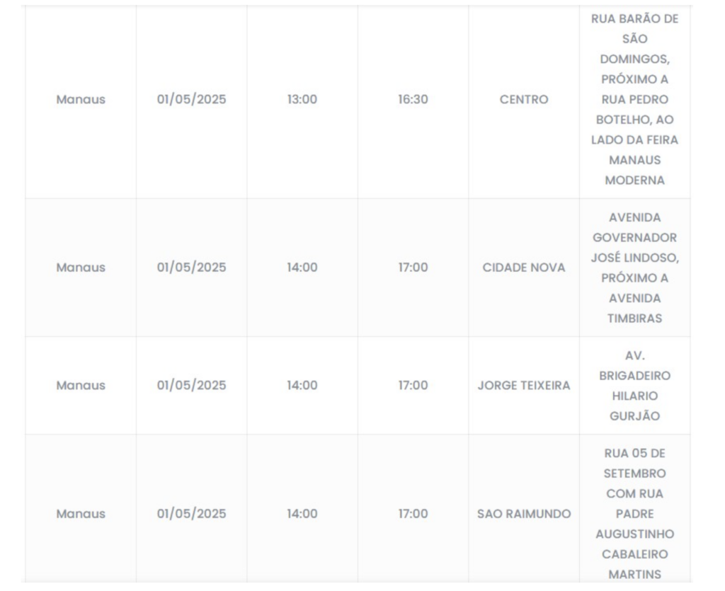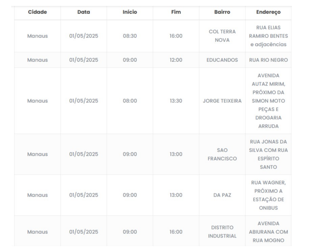 Manaus – A Amazonas Energia irá interromper o fornecimento de energia em dez bairros nesta quinta-feira (1), feriado do Dia do Trabalhador.