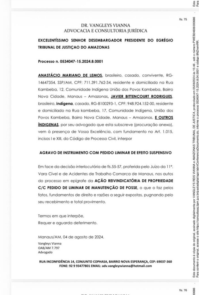 Representado pelo advogado Vangleys Vianna (OAB/AM 7.797), ele afirma ser legítimo ocupante e que o local se trata de território tradicional indígena. O pedido solicita efeito suspensivo para impedir a retirada do grupo até decisão final. O caso está registrado no processo nº 0534047-15.2024.8.04.0001.