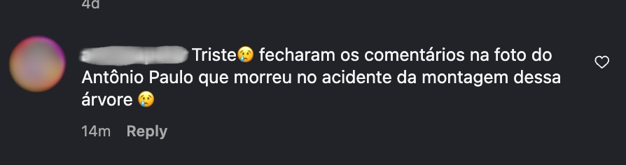 “Triste. Fecharam os comentários na foto do Antônio Paulo que morreu no acidente da montagem dessa árvore”, escreveu um internauta ao perceber que a empresa passou a restringir as interações após as denúncias de negligência ganharem força.
