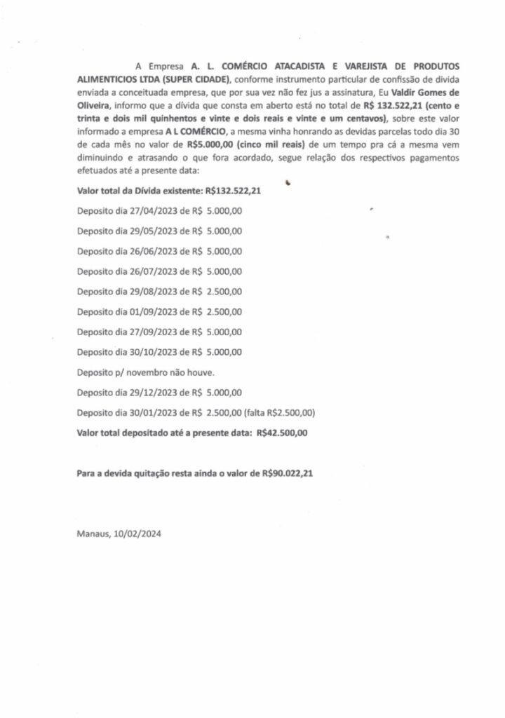 A mãe do empresário justifica os pagamentos parciais alegando dificuldades financeiras que a família vem enfrentando, mencionando até o supostot fechamento de uma das lojas em Coari, interior do Amazonas, como uma das razões. No entanto, o feirante continua sem receber o que lhe é de direito.
