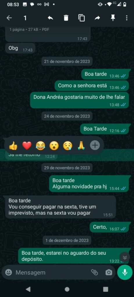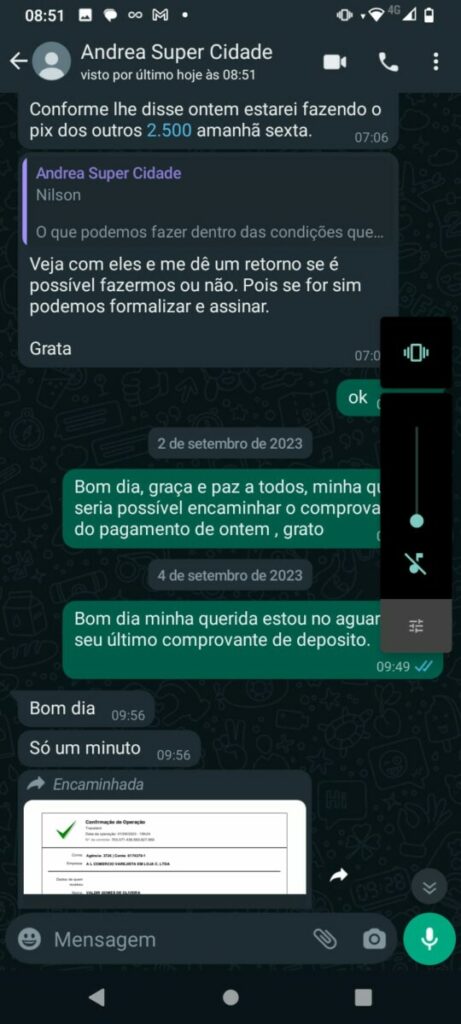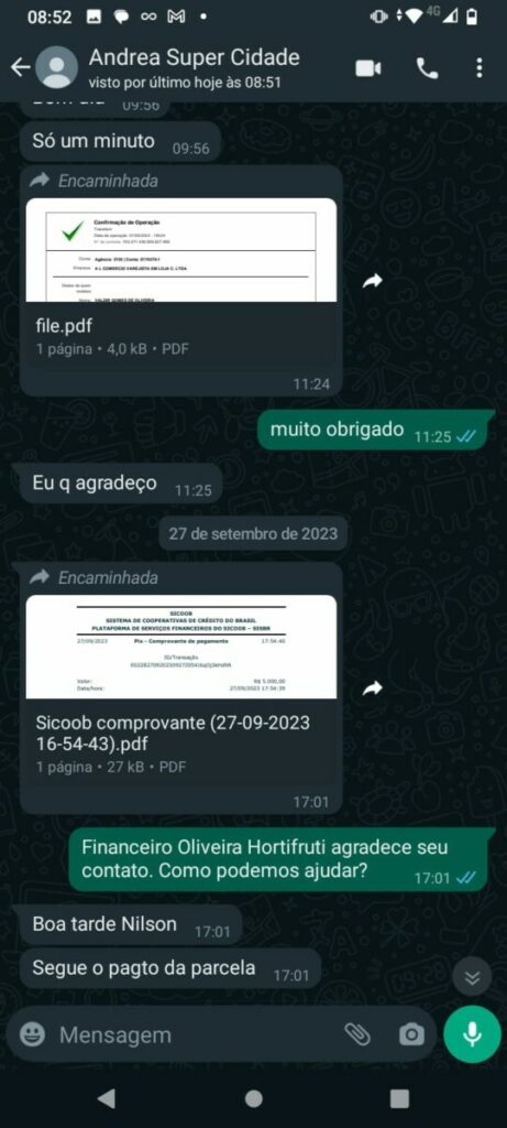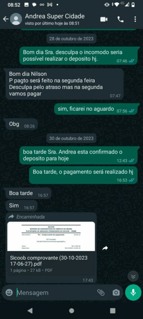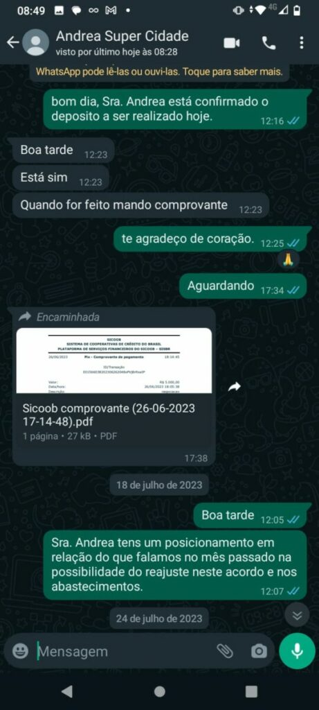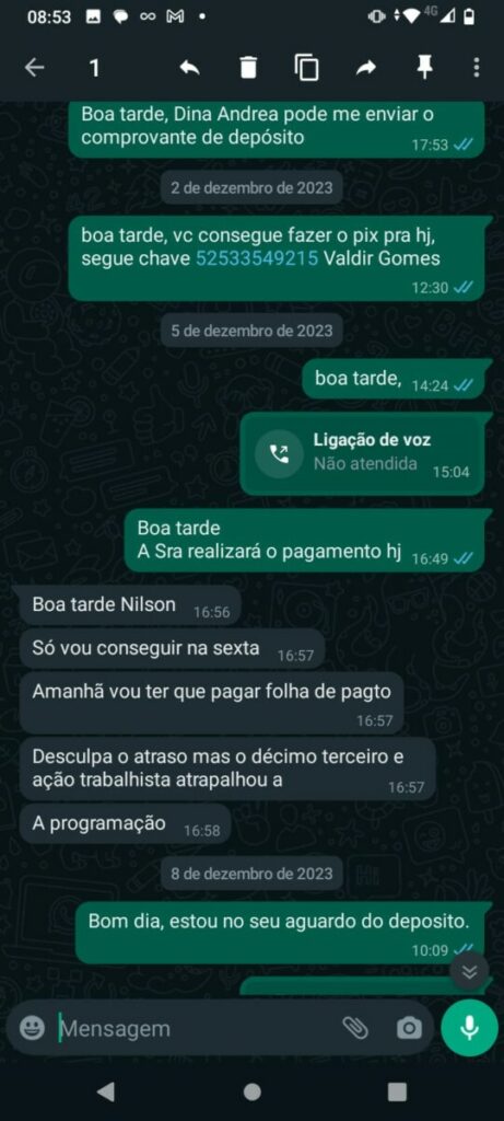 Com a dívida que totaliza R$ 100 mil desde julho de 2023, o feirante expressa sua indignação com a falta de compromisso do empresário. Apesar das promessas, o último pagamento foi efetuado dia 30 de janeiro de 2024, com o valor acordado de R$ 5 mil ainda parcelado de duas vezes.