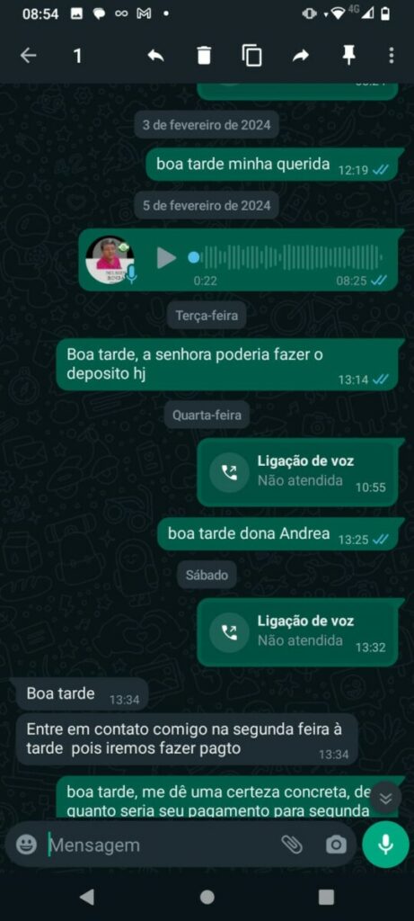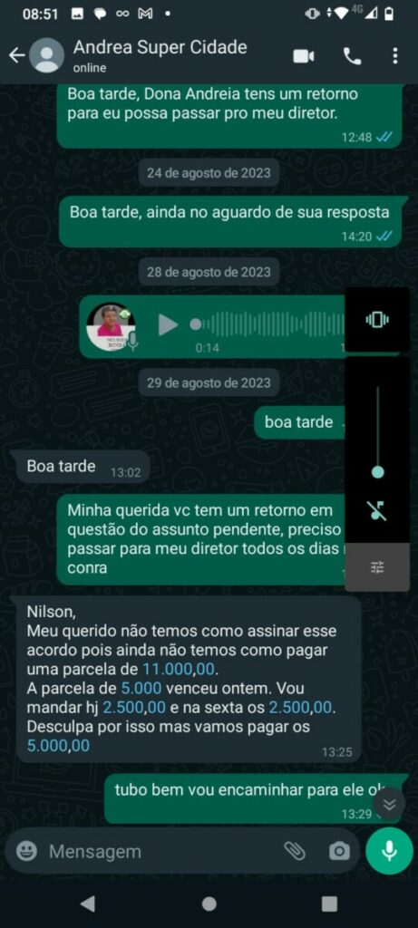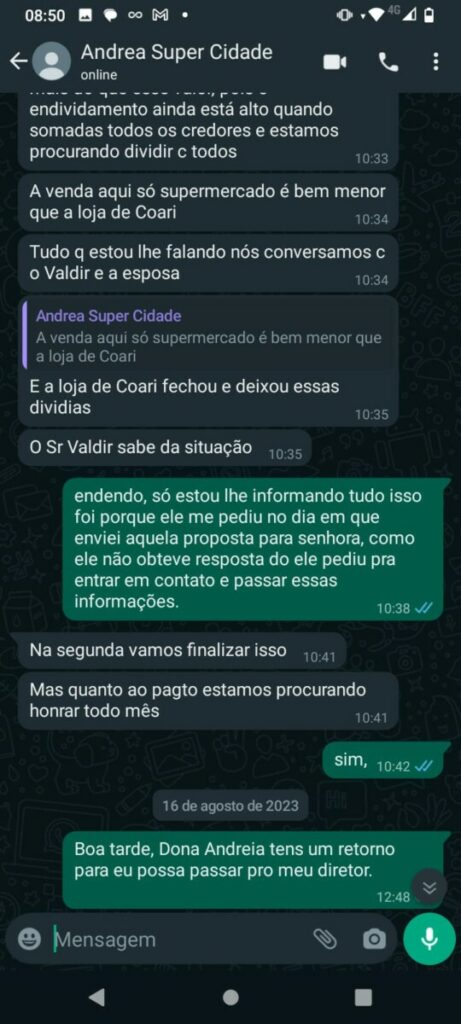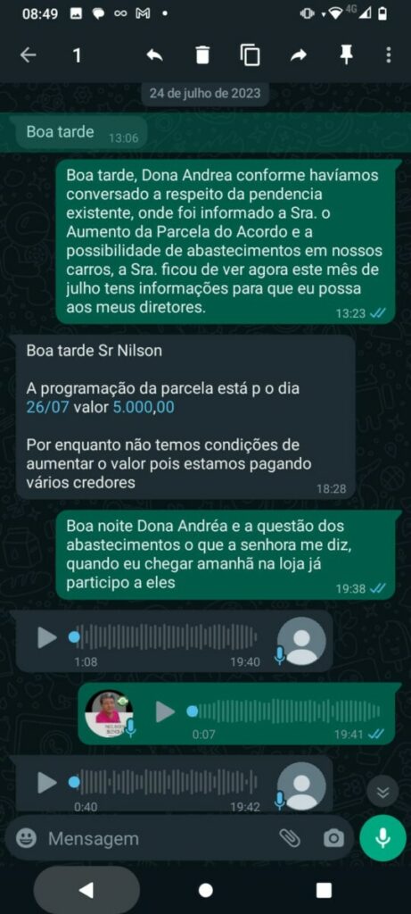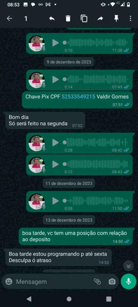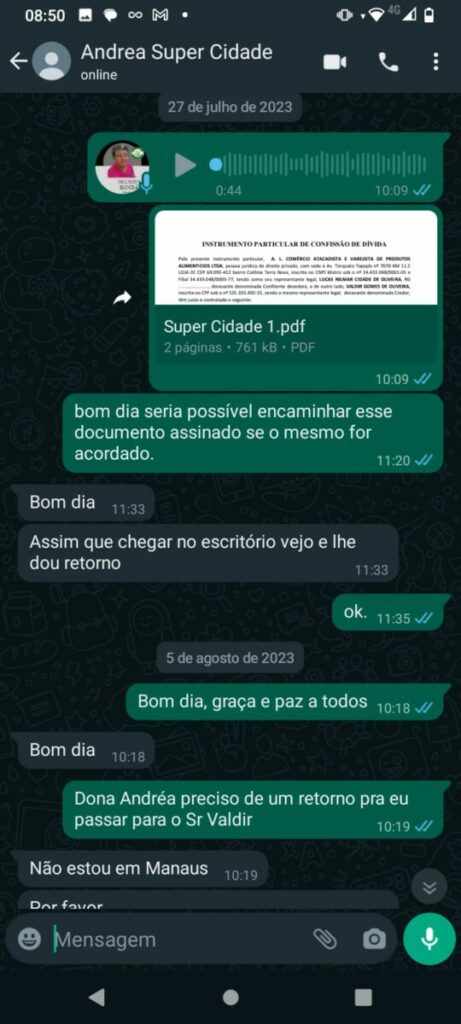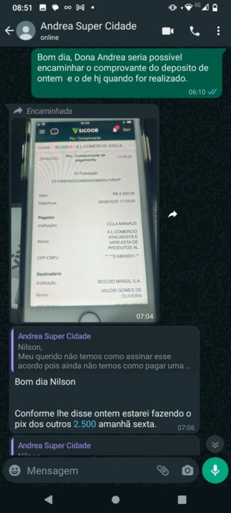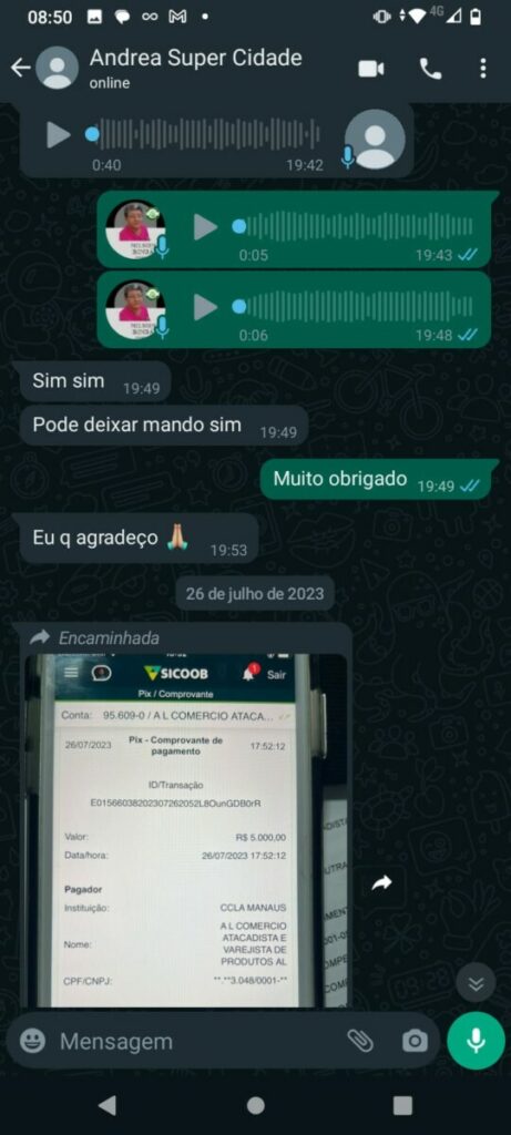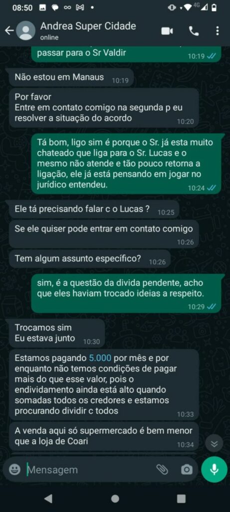 Conversas revelam a frustração do feirante ao tentar receber o pagamento acordado. Em áudios de WhatsApp, o empresário promete resolver a situação do feirante assim que retornasse a Manaus. No entanto, após várias tentativas de contato, o feirante recebe apenas promessas vazias e desculpas esfarrapadas.