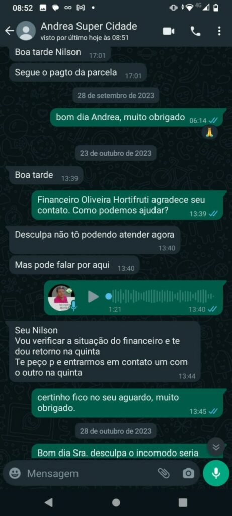 Trechos de conversa com a mãe do empresário mostram a negociação, os pagamentos parciais e as cobranças constantes do feirante em relação aos valores em atraso.