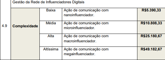 Além disso, parte desse valor poderá ser destinada a influenciadores digitais, variando de R$ 5.390,33 a R$ 49.182,67, dependendo da relevância de mercado do contratado, ou seja: blogueiros selecionados pela empresa de Durango poderão ganhar quase R$50 mil fazendo “publi da prefs”.