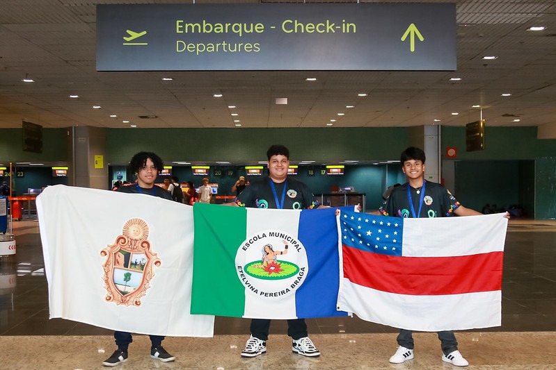 Os alunos Andrew Martins, de 15 anos, Isaac Silva, de 16 anos, e Lucas Oliveira, 13 anos, junto com o professor de ciências e robótica Hermann Oliveira, embarcaram nesta segunda-feira, 13/10, rumo ao Espírito Santo, onde vão competir com estudantes de todo o Brasil.