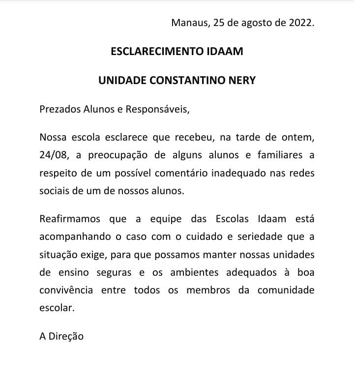 Estudantes do Idaam faltam aula com medo de massacre após ameaça de colega