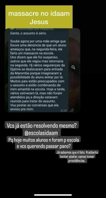 “Ele contou para alguns amigos dele mais próximos que estava enlouquecendo, virando psicopata. Ele tinha um plano matar todo mundo e depois se matar. Depois ele bloqueou todo mundo. Ele disse que queria ver todo mundo queimando no inferno”, conclui a aluna, que afirma ter medo de um possível massacre na escola.