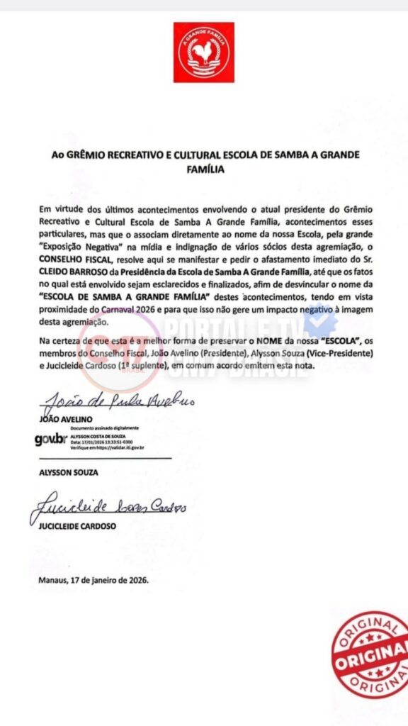 A nota deixa claro que o pedido foi formalizado pelo Conselho Fiscal, mas que a decisão final cabe à diretoria executiva, que deverá ser convocada para deliberar sobre o afastamento e definir quem assume provisoriamente a presidência da Grande Família.