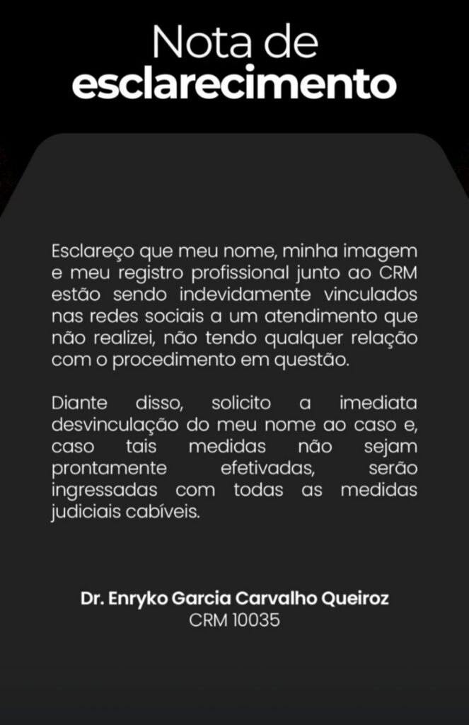 Nas redes sociais, Enryko afirmou que não participou do atendimento e solicitou formalmente a desvinculação do seu nome do caso.