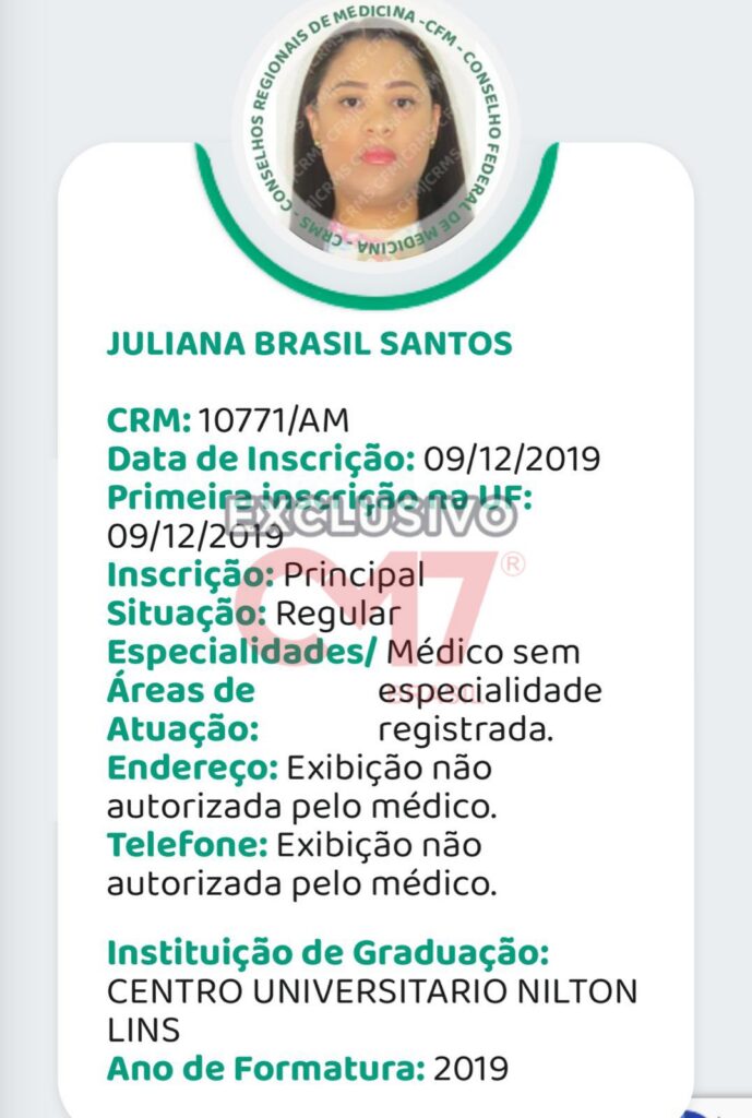 Um detalhe que passou a chamar atenção no caso é a divergência entre a identificação utilizada pela médica e seu registro oficial. Embora o carimbo no receituário traga a indicação “Pediatria”, a consulta no cadastro do Conselho Regional de Medicina do Amazonas (CRM-AM) não aponta título de especialista na área, constando apenas o registro como médica, sem especialidade reconhecida formalmente, o que levanta a questão sobre quais critérios de seleção o Hospital Santa Julia adota para contratação de profissionais na ala pediátrica.