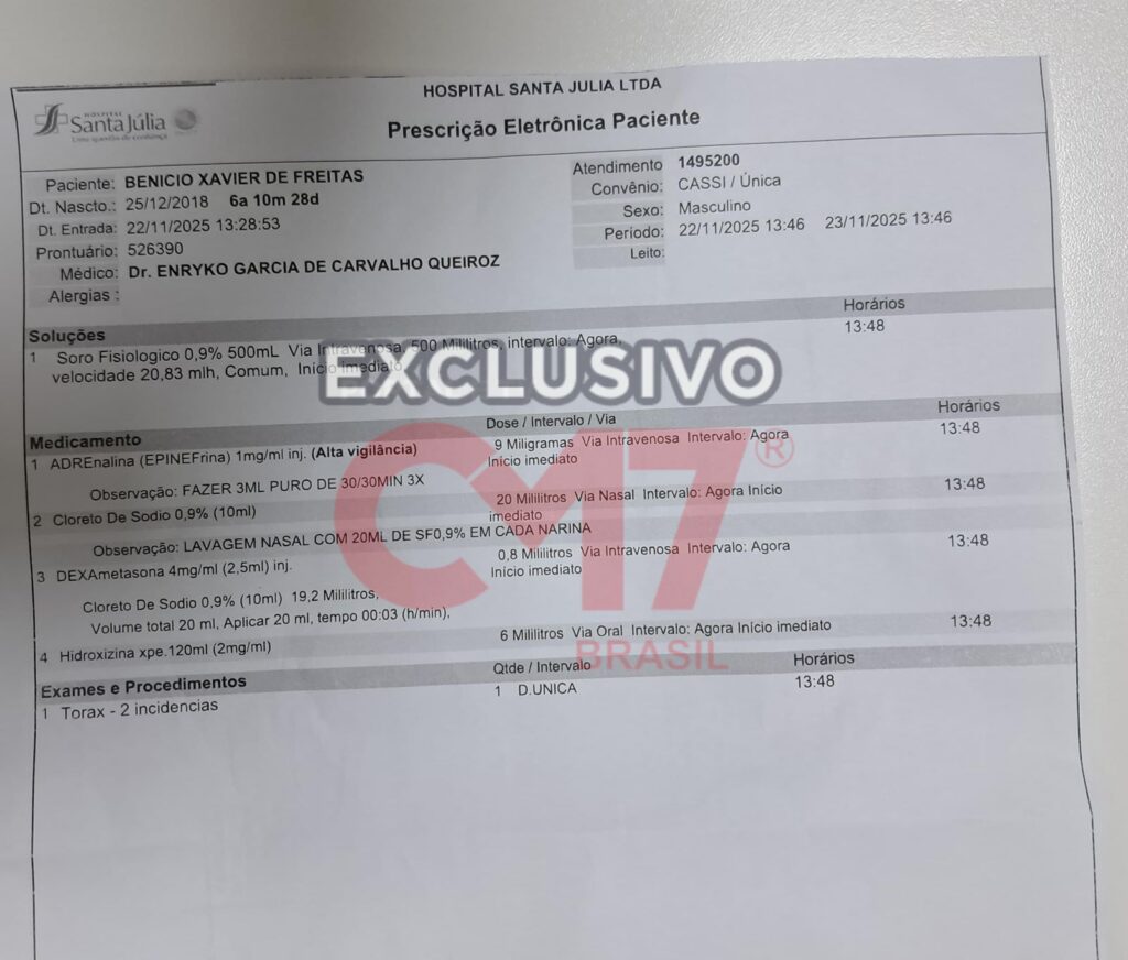 Benício deu entrada na unidade hospitalar às 13h28 do dia 22 de novembro, com tosse seca e suspeita de laringite. Na prescrição eletrônica constava a administração de adrenalina 1mg/ml com orientação de “fazer 3ml puro de 30/30 min 3x”, totalizando 9 miligramas por via intravenosa, quantidade que especialistas apontam ser até 15 vezes superior à recomendada para uma criança da faixa etária.